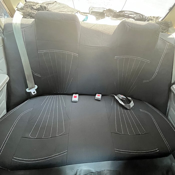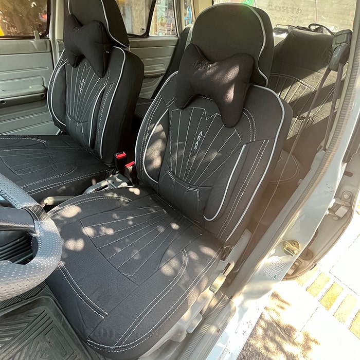 روکش صندلی ماشین پراید صبا پارچه برزنت طرح پرو رنگ مشکی دوخت سفید